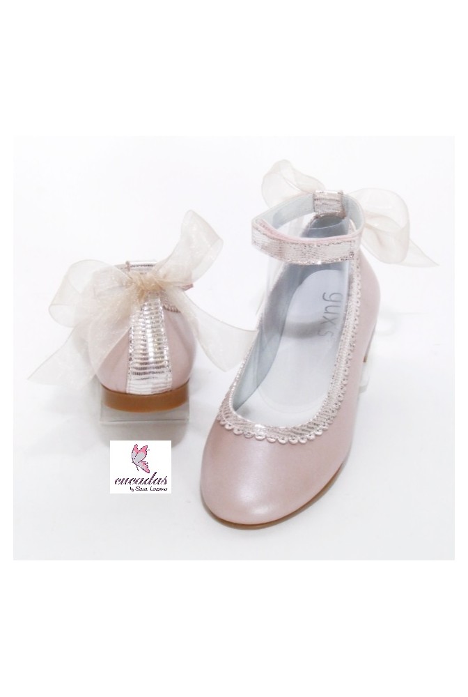 Preciosa bailarina fabricada en suave napa metalizada, con fina correa de cierre velcro al tobillo. Vivo y talonera en contraste. Lazo trasero de organza.