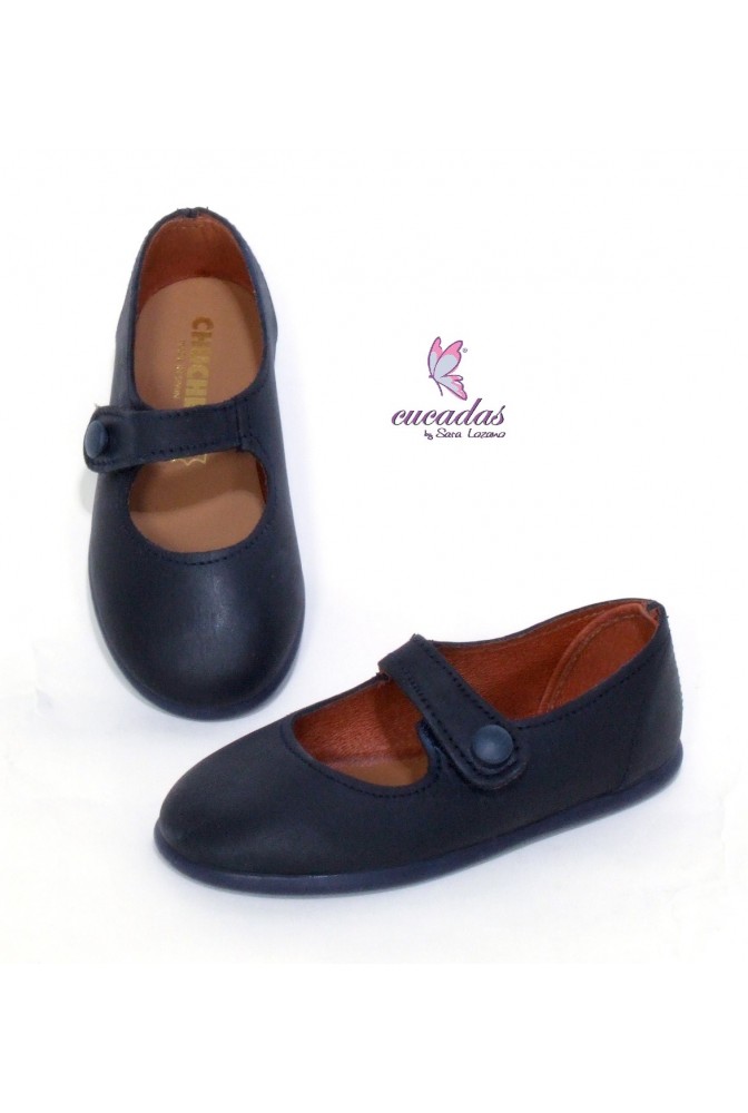 Mercedita con horma de bailarina fabricada en suave napa encerada color marino. Cierre de velcro con adorno de botón. Plantilla de cuero.