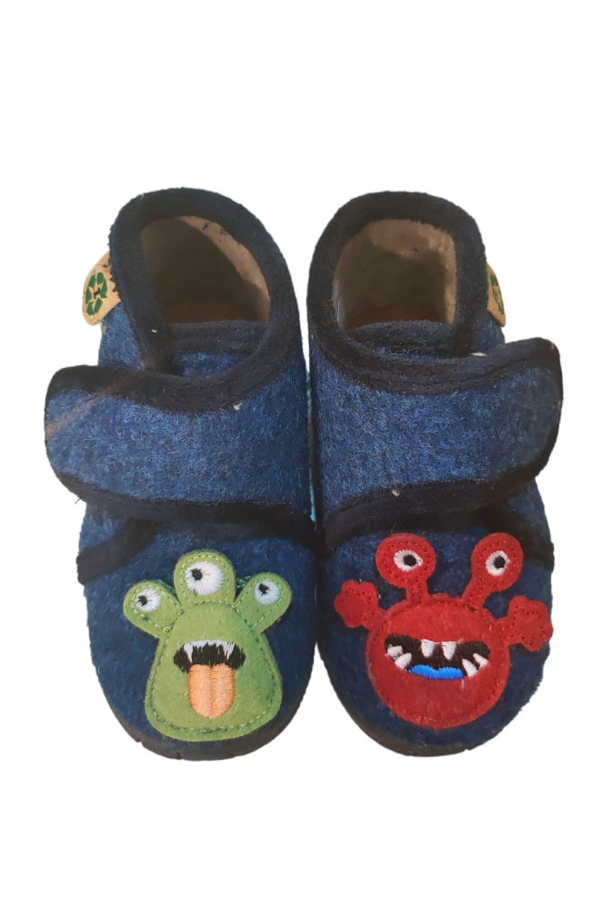 Divertida zapatilla de casa que acompañará los pasos de los peques con el máximo confort. Fabricadas en España con fibra 100% natural en textil de lana y punterita de goma.