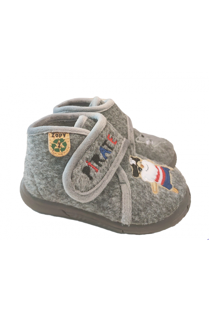 Divertida zapatilla de casa que acompañará los pasos de los peques con el máximo confort. Fabricadas en España con fibra 100% natural en textil de lana y punterita de goma.