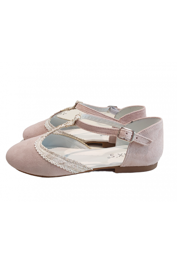 Elegante zapato corte pepito asandaliado. Fabricado en precioso ante color tendencia esta temporada. Corte romántico, vivo y fina correa en piel metal cava en contraste. Forro piel.