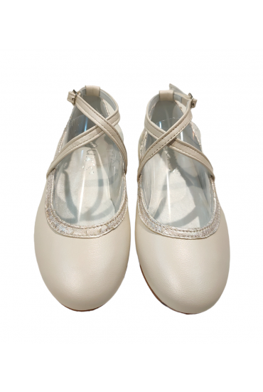 Precioso zapato cruzado fabricado en piel nacarada beige con vivo en contraste.