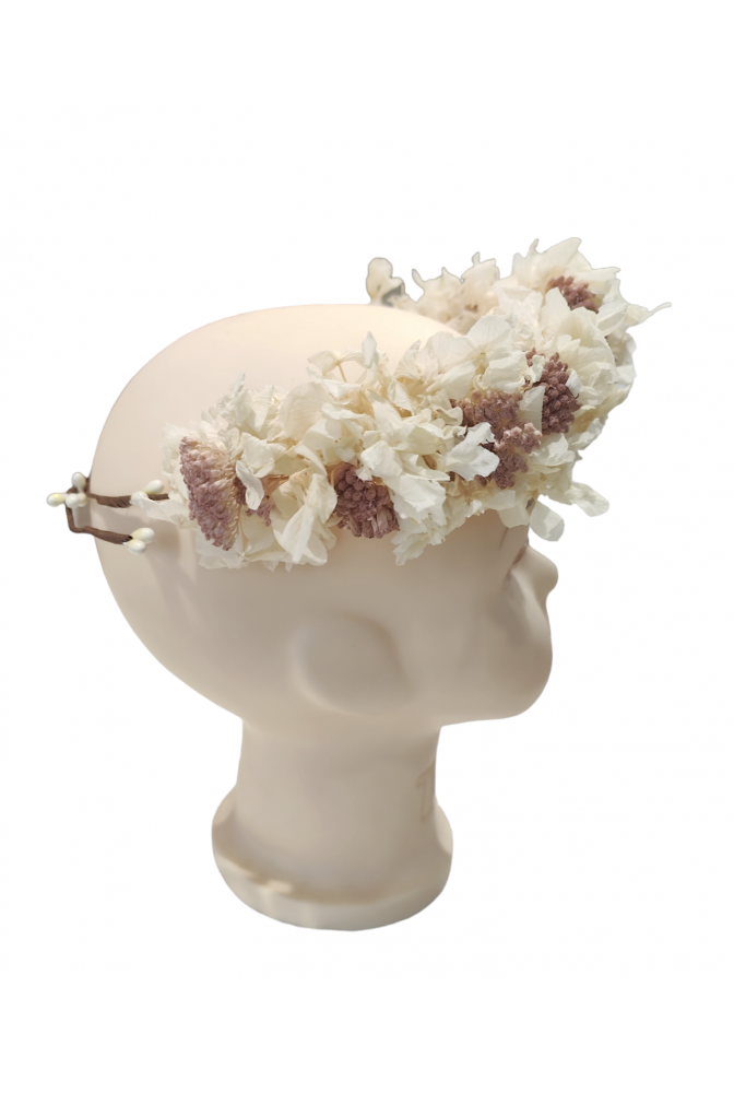 Elaborada artesanalmente a mano con preciosas flores naturales (Achillea/Hortensia beige) preservadas. Ajustable por detrás al diámetro de la cabeza.