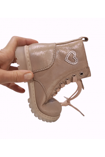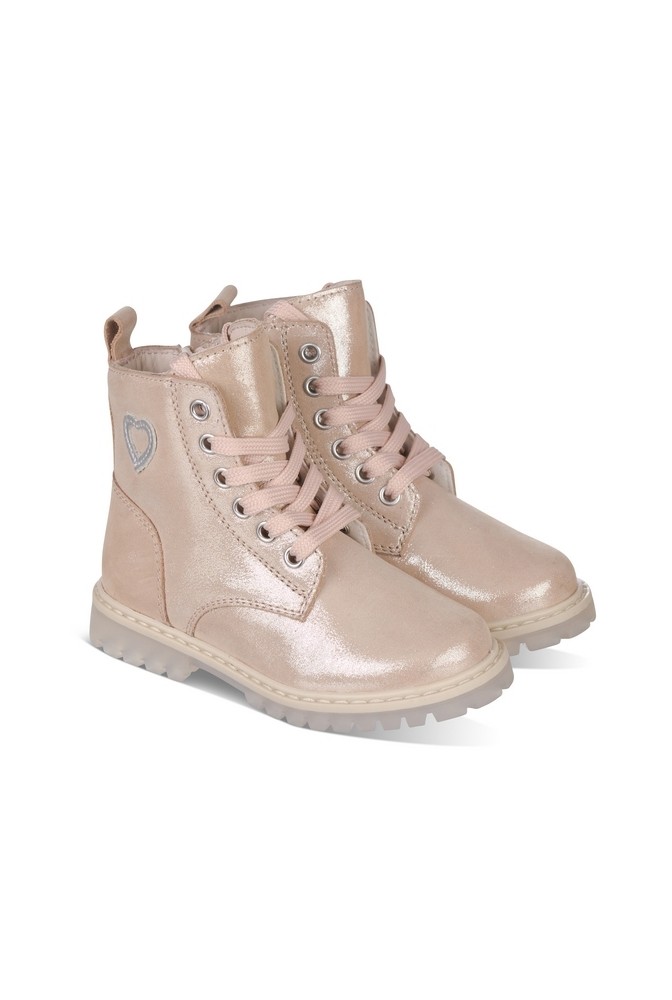 Botita cordones fabricada en piel rosa súper blandita con sutil brillito lurex. Piso sierra aislante de frío y lluvia muy flexible. Cremallera lateral.