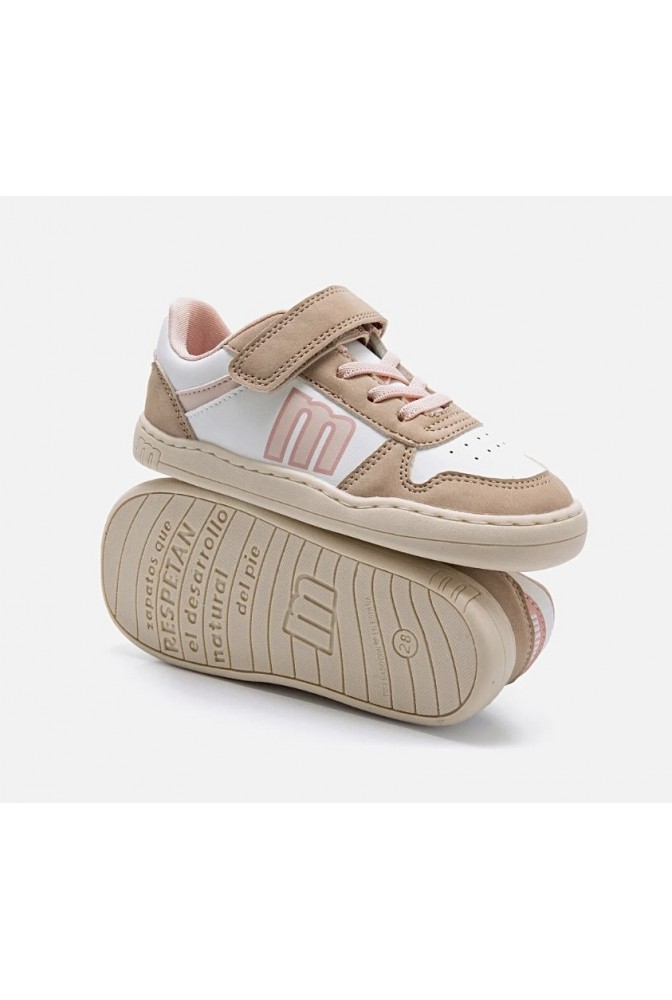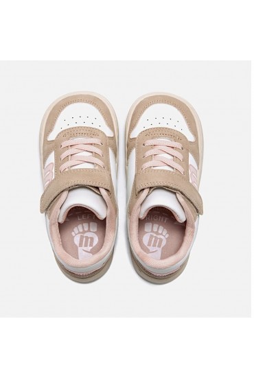 Zapatillas Free de Mustang de color blanco y rosa para niña. Su diseño deportivo casual combina una base blanca con refuerzos en tonos claros y un logo lateral a contraste que aporta un toque actual. El cierre con cordones elásticos y tira adherente facilita el calce, perfecta para el uso diario.
