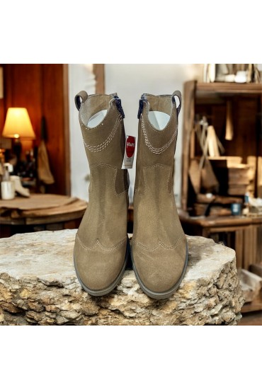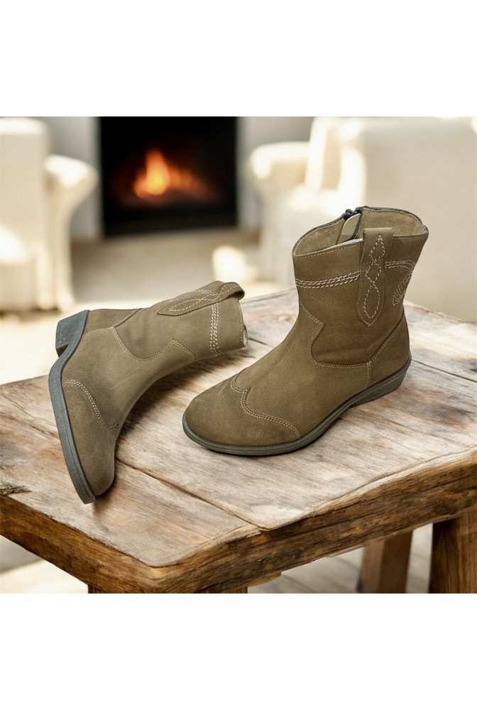 Añade un toque estilo tejano y auténtico a tu look con estos botines de inspiración vaquera perfectas para cualquier ocasión casual. Fabricadas en suave serraje color visón y costuras decorativas que realzan su diseño y estilo western. Suela antideslizante y forro interior suave y cálido que brinda confort todo el día.