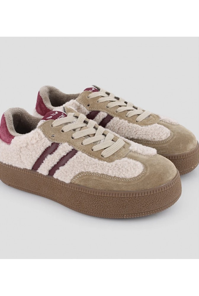Zapatillas beige con textura de peluche y serraje, con detalles en burdeos y marrón. Plataforma de 3,5 cm que ofrece comodidad y estilo. Forro interior en textil transpirable y plantilla en material sintético para un uso diario confortable. Perfectas para mujeres jóvenes que buscan tendencia y confort en su calzado casual.