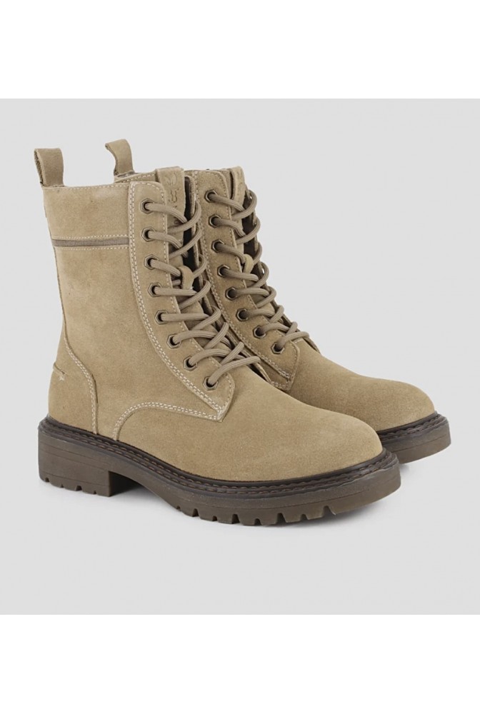 Botines estilo militar en piel de serraje color beige, con plataforma de 4 cm que aporta altura sin renunciar a la comodidad. Diseño con cierre de cremallera lateral y cordones para un ajuste práctico y seguro. Caña de 16 cm y circunferencia de 22 cm. Forro interior en suave textil de pelito, muy calentita, y plantilla en piel que asegura confort y transpirabilidad en cada paso.